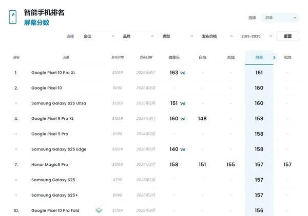 目前DxOMark屏幕测试榜单前五名分别是Google Pixel 10 Pro XL、Google Pixel 10、三星Galaxy S25 Ultra、Google Pixel 9 Pro XL、Google Pixel 9 Pro,几乎是被Google承包了。不过查看完整榜单也能发现,很多国产品牌的新品并未参与测试,尤其是下半年新出的旗舰产品,如果参与了,或许榜单也会发生微妙变化。