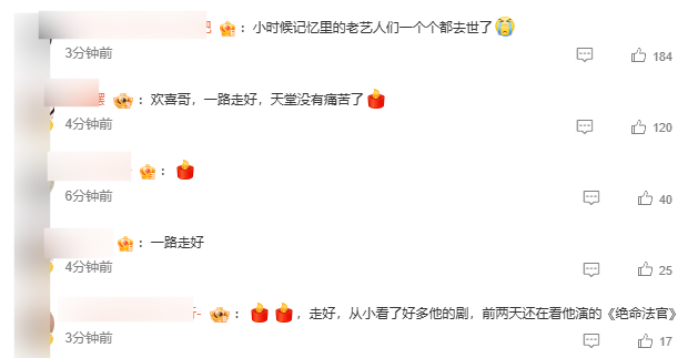 有网友表示:“小时候记忆里的老艺人们一个个都去世了”“走好,从小看了好多他的剧,前两天还在看他演的《绝命法官》”