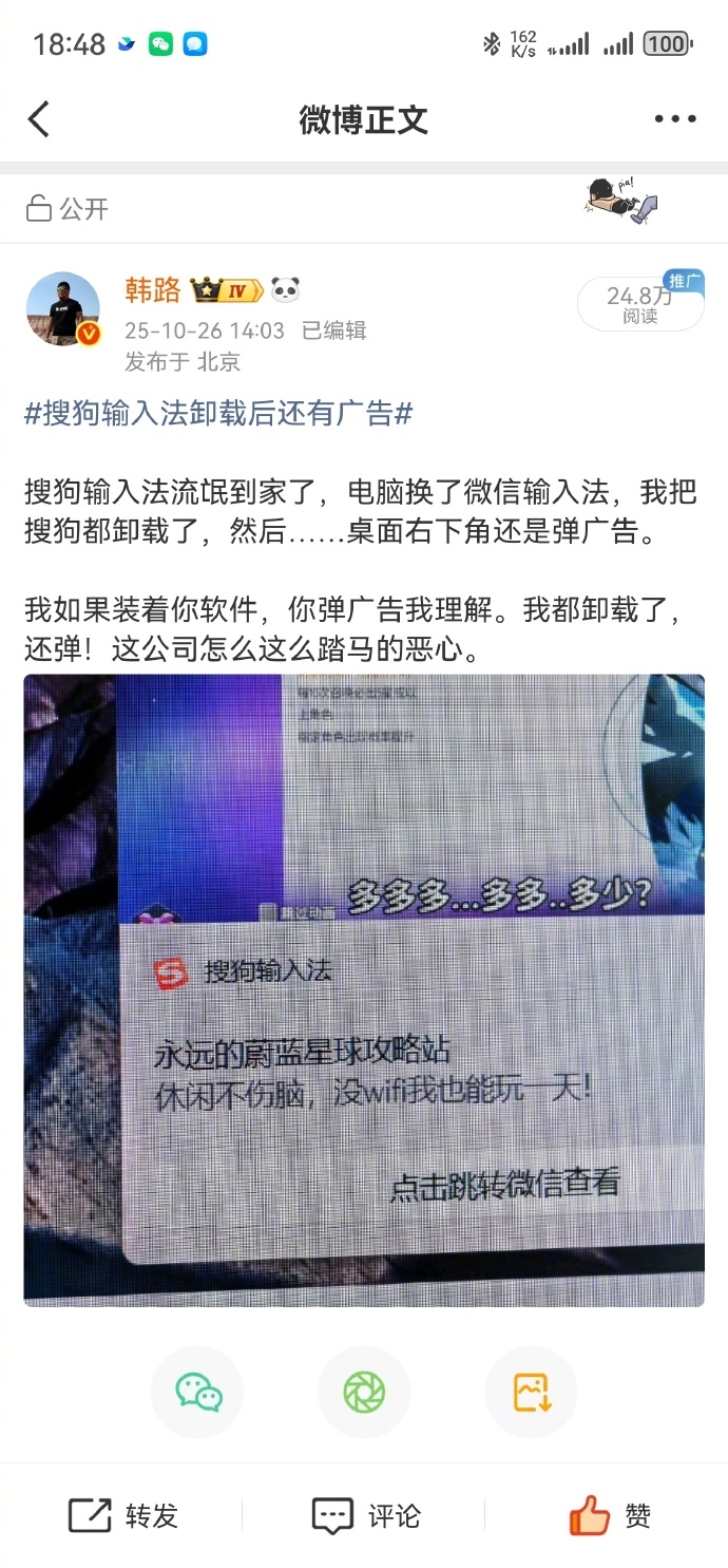 近日,资深车评人@韩路 发微博吐槽搜狗输入法,称其 “流氓到家了”,即便卸载后依然弹出广告,引发众多网友讨论和热议。据韩路描述,电脑换了微信输入法,把搜狗都卸载了,然后……桌面右下角还是弹广告。 “我如果装着你软件,你弹广告我理解。我都卸载了,还弹!”