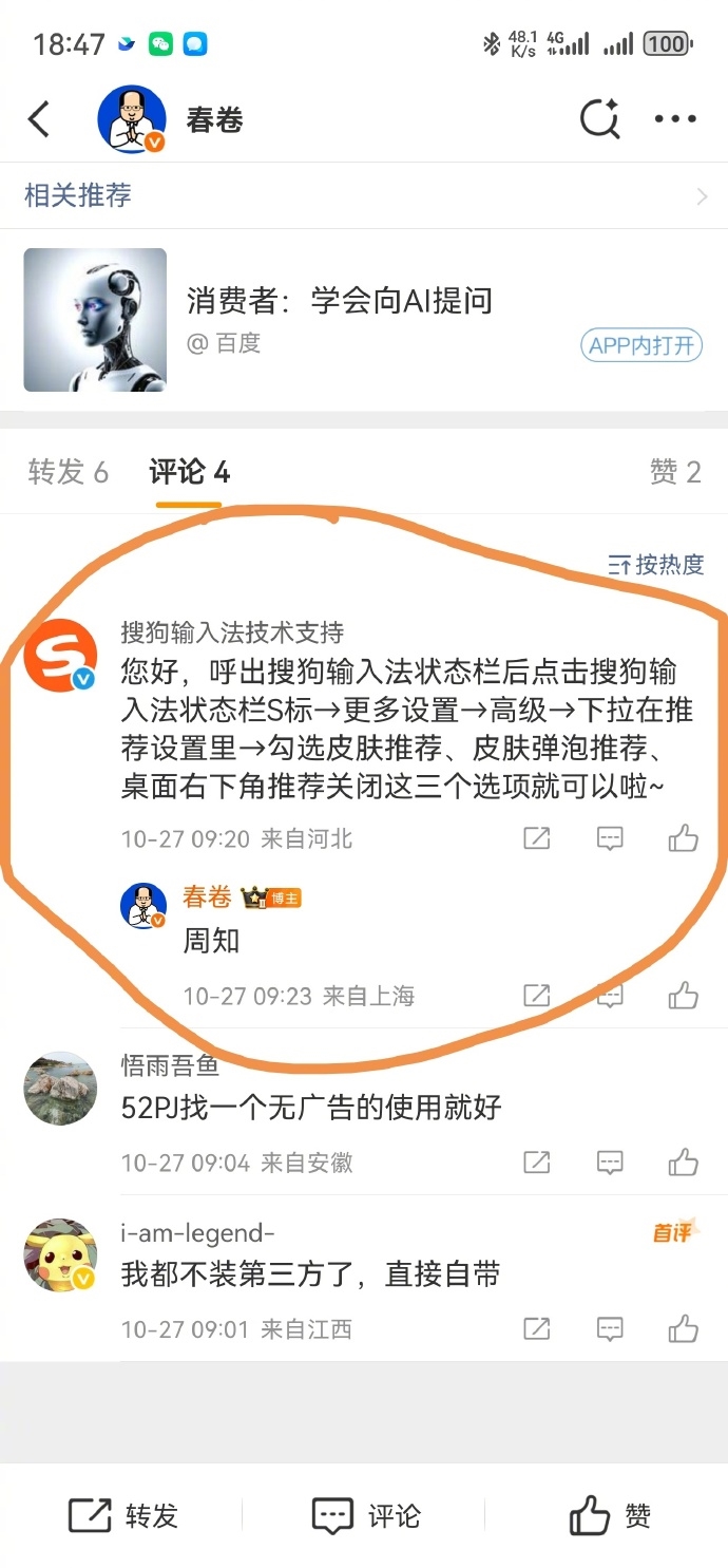 该回应再次引发韩路不满。他表示:“继续批评搜狗输入法的官号,也不看看我投诉的是啥?我都卸载了,还弹广告,搜狗给的解决办法是:再把输入法装回来,我再设置一遍去掉广告……