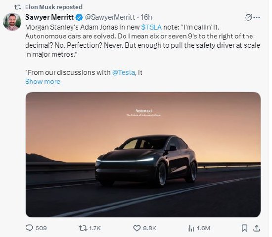 电动汽车分析师索耶·梅瑞特在社交平台X上分享了乔纳斯的上述观点,马斯克转发了这条帖子。