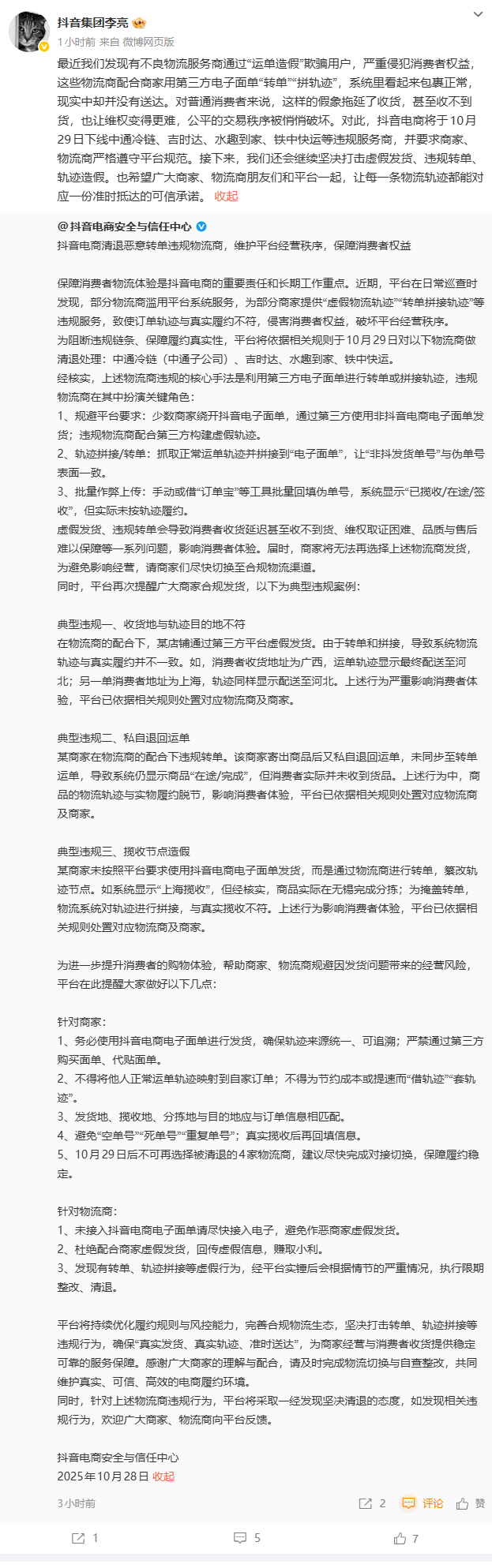 抖音集团副总裁李亮转发文章并表示,最近我们发现有不良物流服务商通过“运单造假”欺骗用户,严重侵犯消费者权益。