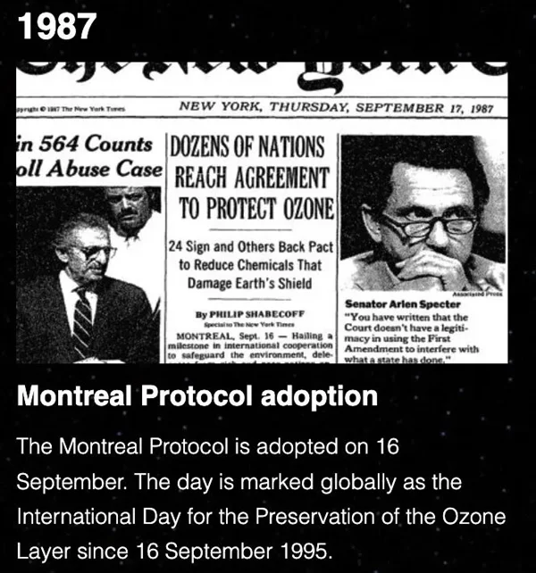 于是在1987年,人类商定了一项被载入史册的协议——《关于消耗臭氧层物质的蒙特利尔议定书》。这份协议在全球范围内,开始逐步限制、淘汰那些破坏臭氧层的化学物质。