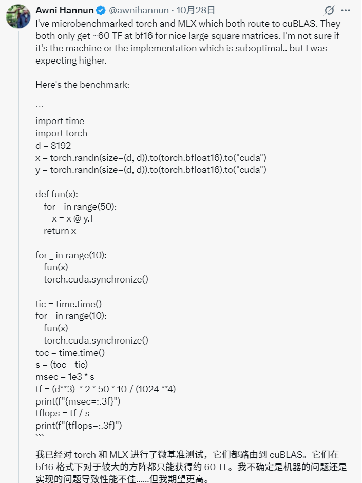 苹果MLX框架的首席开发者Hannun在回复Carmack时,确认他在自己的基准测试中得到了相似的结果。