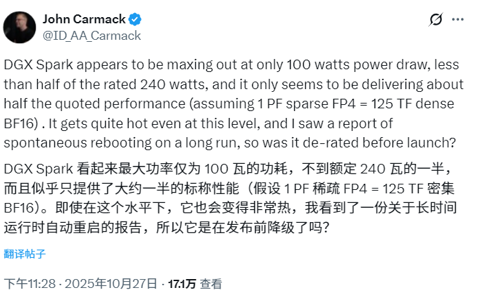 NVIDIA的迷你AI超算DGX Spark在前不久终于正式上市,起步价高达3999美元(约28396元人民币)。不过近日id Software联合创始人John Carmack在社交媒体称,DGX Spark的实际功耗和性能均远低于官方宣传值。