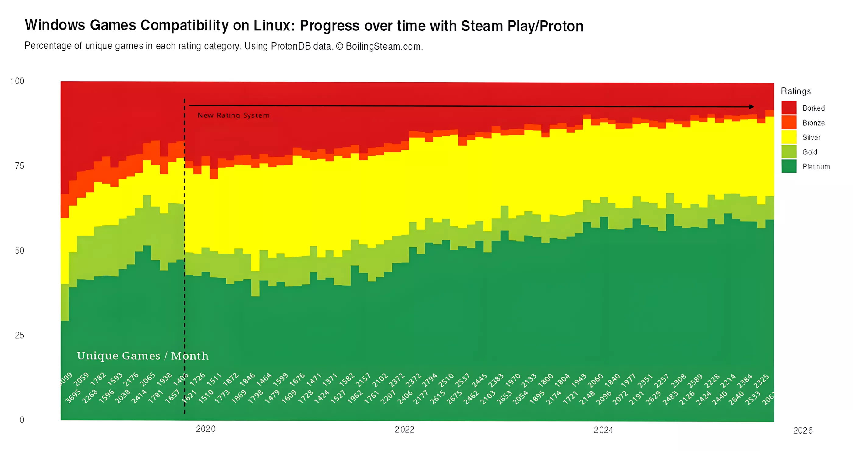 这一进展主要得益于Linux社区及相关项目的共同努力。ProtonDB是一个基于用户报告、专注于Valve Proton技术的非官方社区网站。该技术源自Wine项目,为Windows原生API(如DirectX)提供转换层,使众多原本仅支持Windows的游戏能够在Linux上运行。ProtonDB以兼容性等级对游戏进行评定——“铂金”级游戏可直接完美运行,“黄金”级仅需少量调整即可流畅运行,“白银”级在可玩性上略有不足,而“铜牌”及“损坏”则代表游戏可用性较差或完全无法运行。