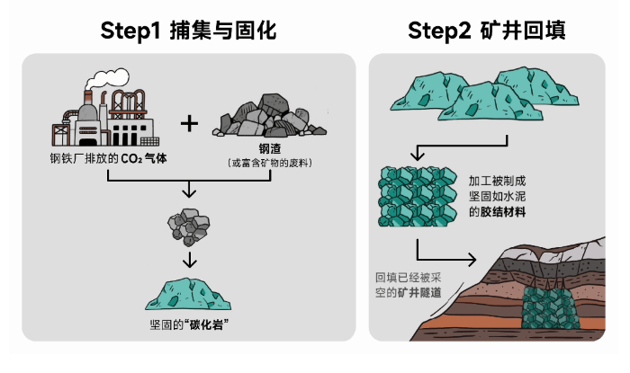 第二步为矿井回填,这些“吃饱碳”的碳化岩被制成类似水泥的胶结材料,泵入地下采空的矿井隧道,既能加固矿井结构、防止地面沉降,又能让固定CO2的“石头”长久深埋,实现碳的永久性封存。