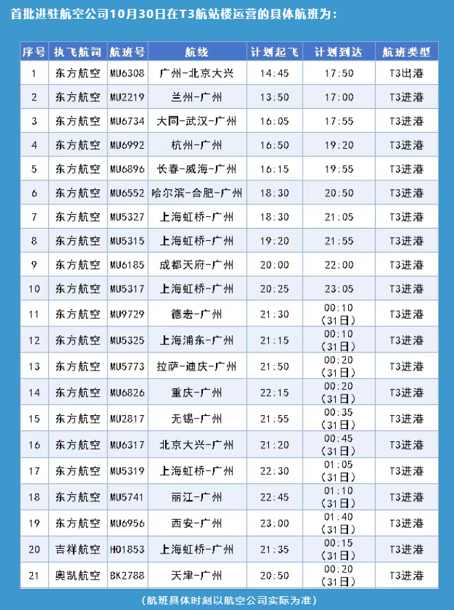 10月31日起,东方航空、上海航空、中国联合航空、吉祥航空、奥凯航空的国内进出港航班均调整至白云机场T3航站楼运营,东方航空的国际航班暂保留在T1航站楼运营。