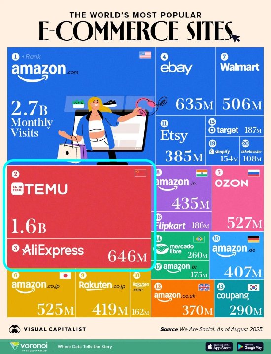 据商业分析媒体VISUAL CAPITALIST报道,2025年,全球访问量前三大电商平台分别为亚马逊、Temu和阿里速卖通AliExpress。据悉,该排名数据来自We Are Social机构,统计的是2025年6-8 月期间的月平均访问量。其中亚马逊以27亿次的月访问量占据榜首,中国跨境电商平台Temu和速卖通分列二、三位。