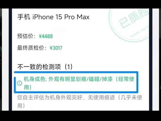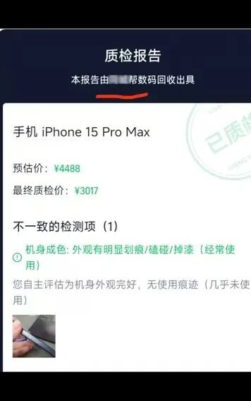 10月15日,平台显示已经收到旧手机。然而,回收价格却变为3017元,与之前平台显示回收价相差1471元,而理由则是旧手机存在明显磕碰划痕和掉漆。