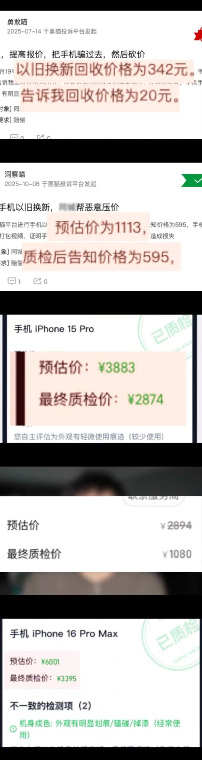 例如有网友约定6001元手机回收价格,到手后也以磕碰为由压价到3395元;有网友约定回收价2800余元手机,最终压价到1080;甚至还有约定回收价342元的手机,被压价至20元的情况。