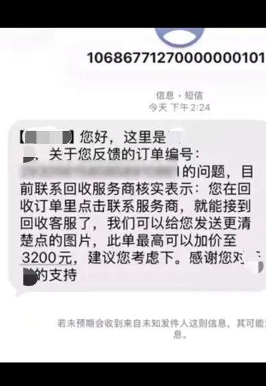 然而,提出要回收商出具开箱视频诉求后,该博主称并未收到任何视频,仅在之后收到一条短信通知称,是否愿意以3200元回收价回收手机。