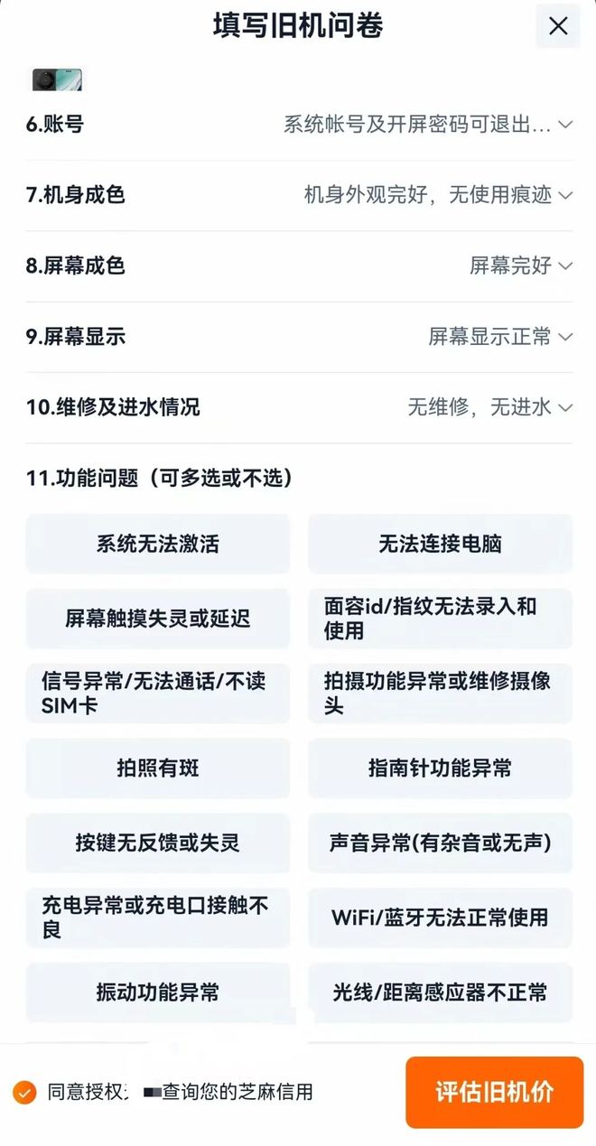 测试发现,若要将自己旧手机换购,仅需回答平台提供的一些关于手机情况的问题,包括屏幕是否损坏、机身是否有划伤等。而整个过程并不需要用户提供照片或者视频证明。