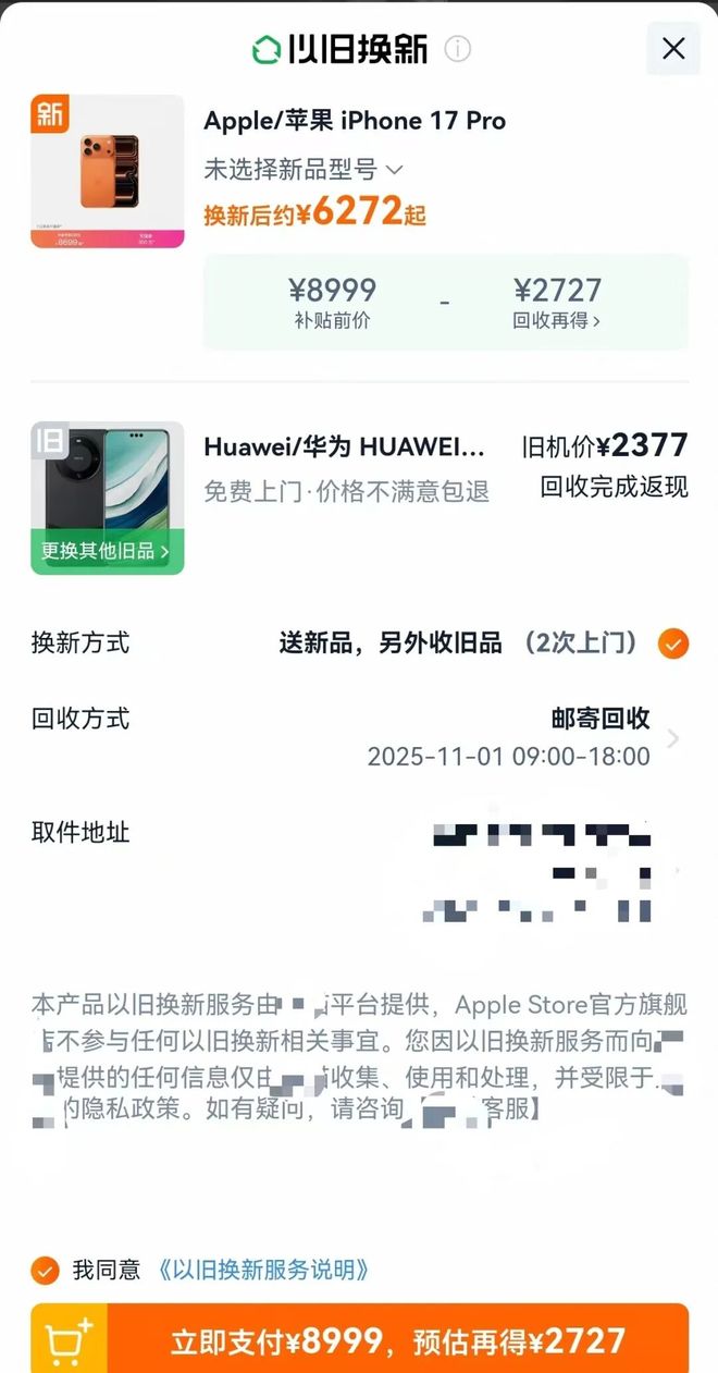 这名博主表示,9月13日,自己在电商平台上的苹果旗舰店以以旧换新形式购买了一台iPhone 17 Pro Max;同时经平台官方的以旧换新服务评估,其旧手机回收价为4488元。