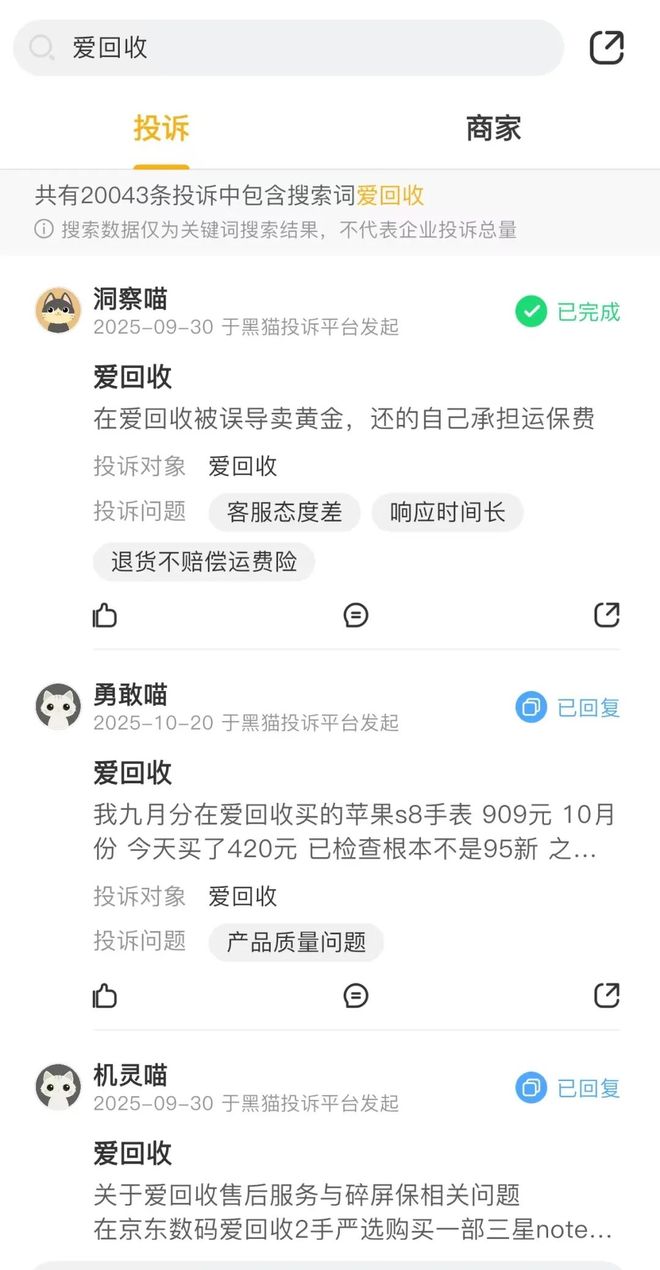 例如在新浪黑猫投诉平台上,有关爱回收的投诉信息高达2万余条;