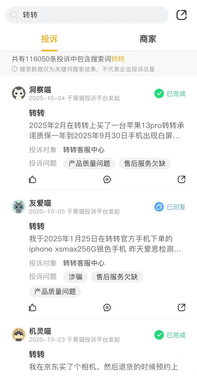 而关于转转的投诉信息数量更是高达11.6万余条。