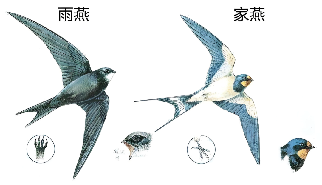 中国叫“燕子”的鸟有很多,它们主要来自两个类群——燕科和雨燕科。这两个类群遗传关系其实非常遥远,但是它们的外观特征,以及飞行特性上都非常相似,普通人难以辨别彼此。