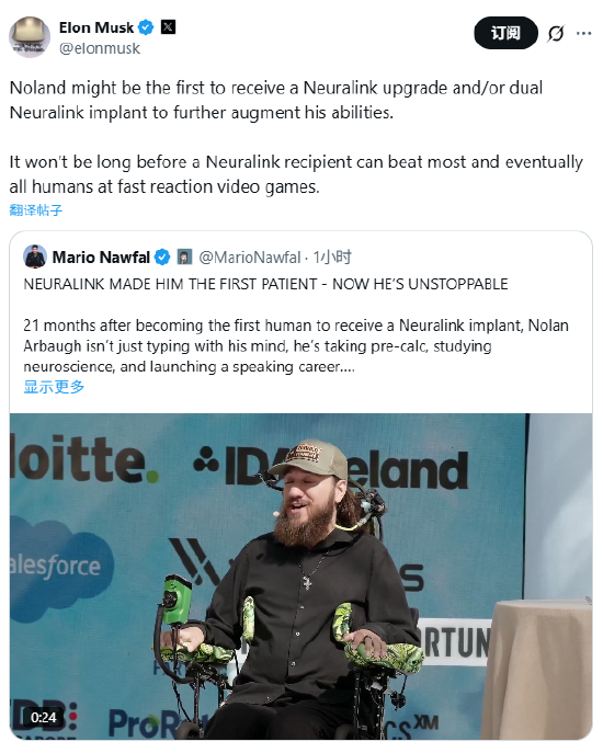 埃隆·马斯克转发了有关全球首位植入Neuralink设备的人诺兰・阿博(Nolan Arbaugh)的相关报道。该报道称,成为全球首位植入Neuralink设备的人类21个月后,诺兰不仅能用意念打字,还在学习预修微积分、研究神经科学,同时开启了演讲生涯。
