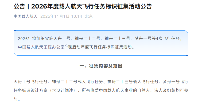 中国航天官方今天发布了《2026年度载人航天飞行任务标识征集活动公告》,其中包括天舟十号飞行任务、神舟二十二号载人飞行任务、神舟二十三号载人飞行任务、梦舟一号。这也算正式确认,梦舟一号将在2026年发射。