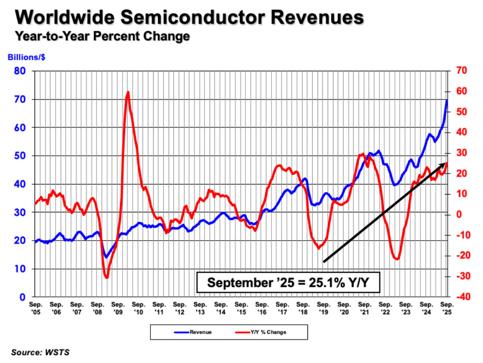 美国半导体行业协会(SIA)今日宣布,2025年第三季度全球半导体销售额达到了2084亿美元,较第二季度增长15.8%。2025年9月的全球销售额为695亿美元,同比增长25.1%(2024年9月为555亿美元),比今年8月增长7.0%。