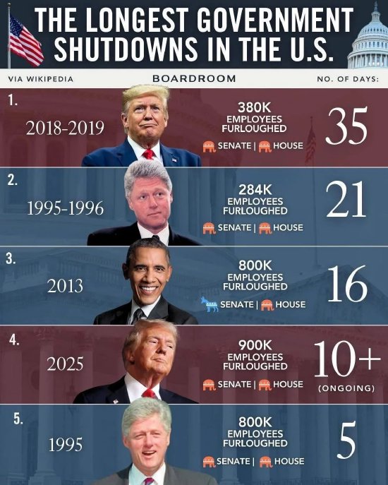 这一次是自1981年以来的第15次政府停摆。与以往不同的是,此次停摆不仅持续时间长,而且颠覆了以往的党派动态——过去政府停摆往往是由共和党人挑起的。