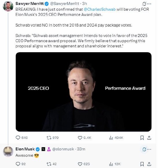 他转发嘉信理财的声明称:“嘉信理财资产管理公司打算投票支持2025年CEO绩效奖提案。我们坚信,支持这一提议符合管理层和股东的利益。”