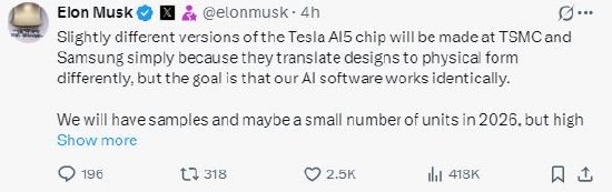 马斯克在社交平台X上对一位网友发布的一条关于特斯拉AI5芯片将于2026年生产的帖子进行了澄清,称这款人工智能芯片可能要到2027年才能量产,而AI6芯片要等到2028年。马斯克写道:“台积电和三星将生产略有不同的特斯拉AI5芯片版本,因为它们将设计转化为物理形式的方式不同,但目标是我们的AI软件同样有效。