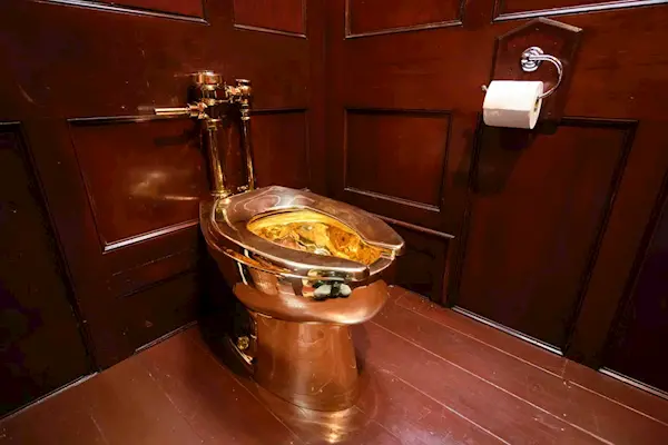 2019年在英国布莱尼姆宫展出时,5名劫匪驾车撞开大门,用大锤破窗而入,在短短5分钟内拆解并偷走黄金马桶,现场因水管破裂"水漫金山",增加了调查难度。