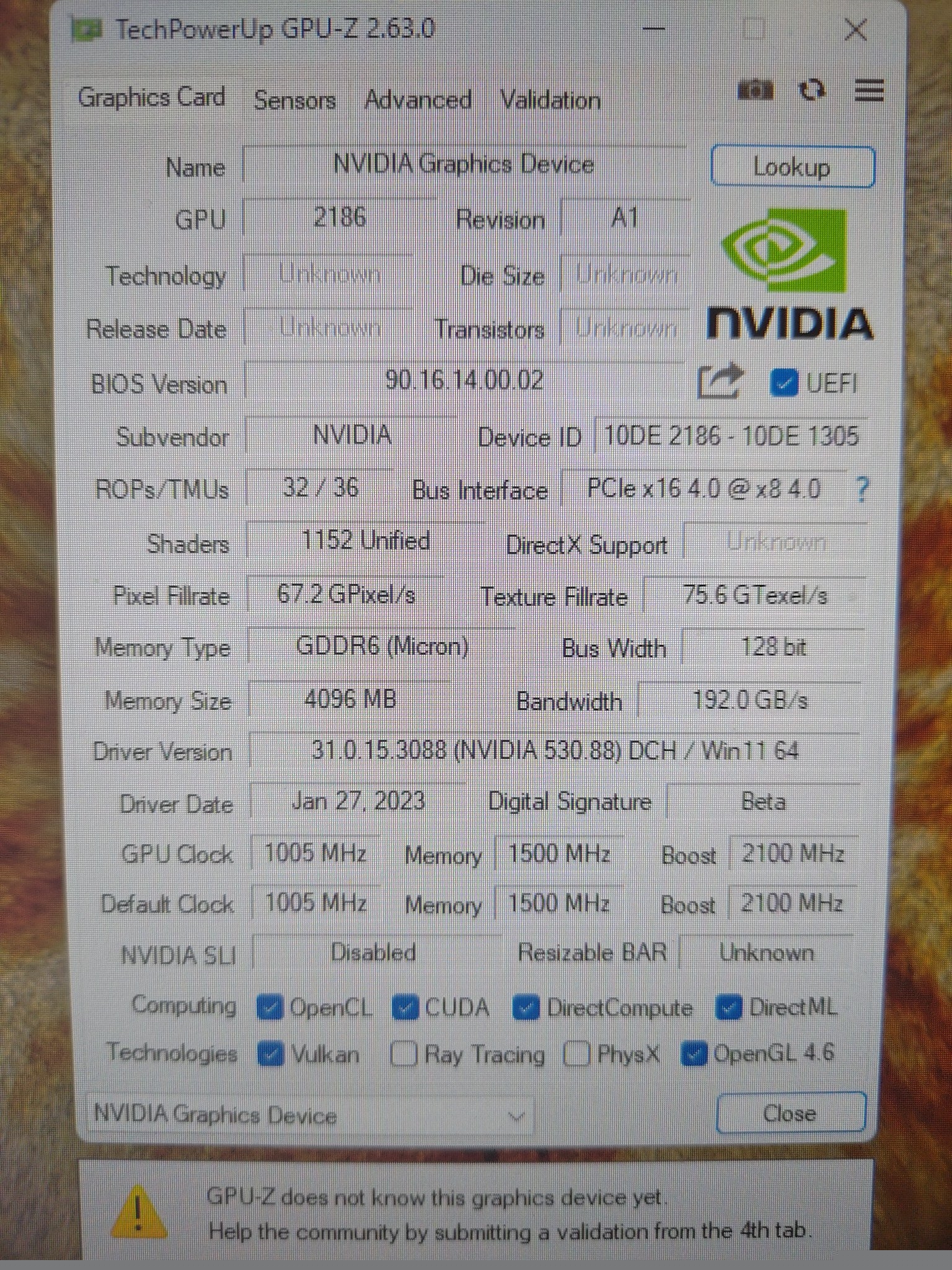 GPU-Z识别的信息残缺不全,型号什么的都没有,但是能看到1152个CUDA核心、36个纹理单元、32个ROP单元,如果没错的话比零售版少了128个CUDA核心、44个纹理单元。