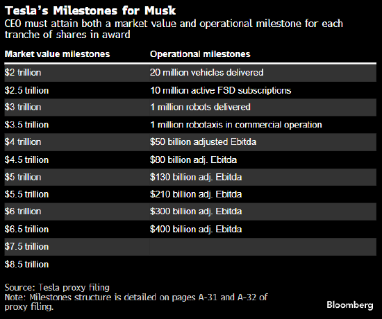 此次薪酬方案包含 12 批股票奖励,需特斯拉在未来十年内达成特定里程碑方可授予。方案还将提升马斯克在公司的投票权 —— 这一安排回应了他自 2024 年初以来公开提出的诉求。届时,他在特斯拉的持股比例将从约 13% 提升至 25%,持股数量增加逾 4.23 亿股。