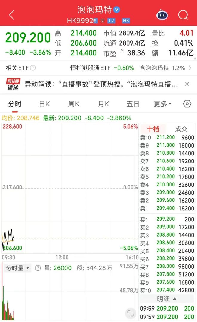 自8月以来,泡泡玛特股价一路下跌。今早开盘,截至发稿,泡泡玛特股价跌超3%,报209.2港元/股,总市值2809亿港元。