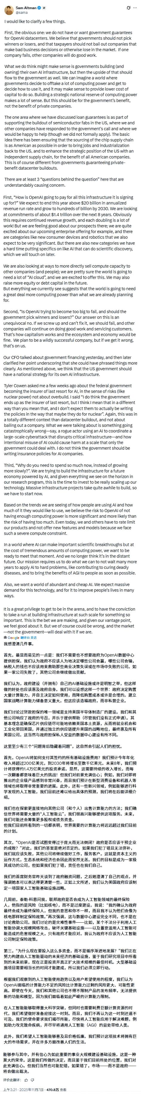 Altman承认,OpenAI首席财务官昨日关于政府融资的言论引发了误解,她后来澄清本可以表述得更清楚。他重申,OpenAI认为美国政府应该为自己的人工智能基础设施制定国家战略,而非为私营企业提供担保。