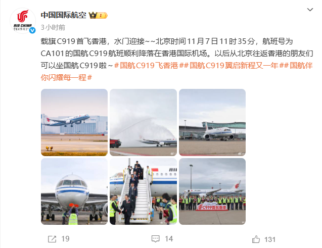 据中国国际航空官微,今日,航班号为CA101的国航C919航班顺利降落在香港国际机场。这是国产大飞机C919首次身披五星红旗执行北京至香港航线,飞机缓缓滑行通过象征民航界最高礼遇的“水门”。
