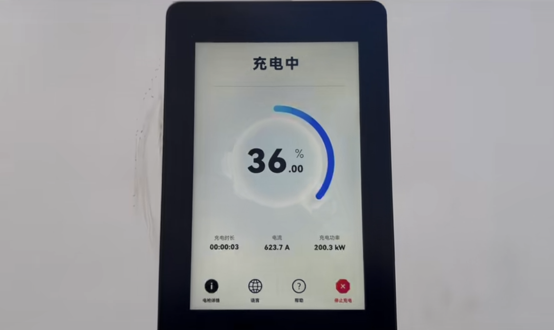 实测中,开充3秒功率就达到200千瓦,12秒攀升至580千瓦,23秒就接近1000千瓦,速率相当高。