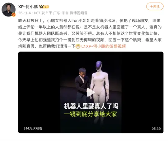 6日上午,何小鹏微博回应:昨天科技日上,小鹏女机器人Iron小姐姐走着猫步出场,惊艳了现场朋友,结果线上评论一半以上的人竟然都在说:是不是女机器人里面藏了一个真人。这真的是让我们机器人团队既高兴,又哭笑不得。总有人不相信这个世界变化如此快,今天早上他们强迫我拍个一镜到底无剪辑的视频,回应一下这个质疑,希望大家辨别真假,也帮助我们澄清一下。