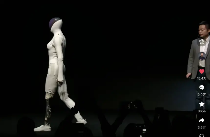 而小鹏科技日,一个名为IRON的“女性”人形机器人踩着猫步走上舞台。她步伐轻盈,腰肢微摆,甚至在现场与观众进行眼神交流,再次引起了人们对于机器人的轰动。