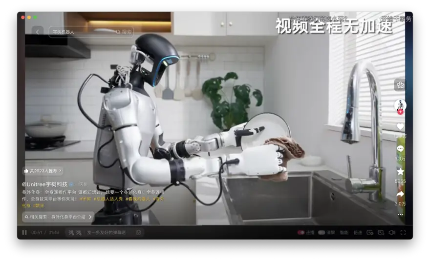 例如,11月6日,宇树科技发布了全身遥操作平台相关内容。视频中,在人类遥操作的控制之下,宇树的G1机器人能够进行洗碗、使用扫地机器人清洁、整理衣物、端水等家务活动。
