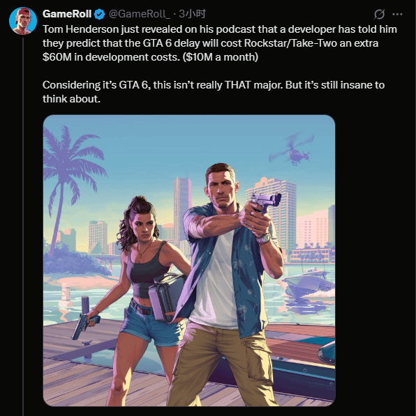 此外,Henderson还透露,有开发者告诉他,《GTA 6》的延期预计将让R星和Take-Two额外花费约6000万美元的开发成本(大约每月1000万美元)。以及,他认同彭博社记者Jason Schreier此前的消息,称此次延期与R星近期的工会裁员无关。