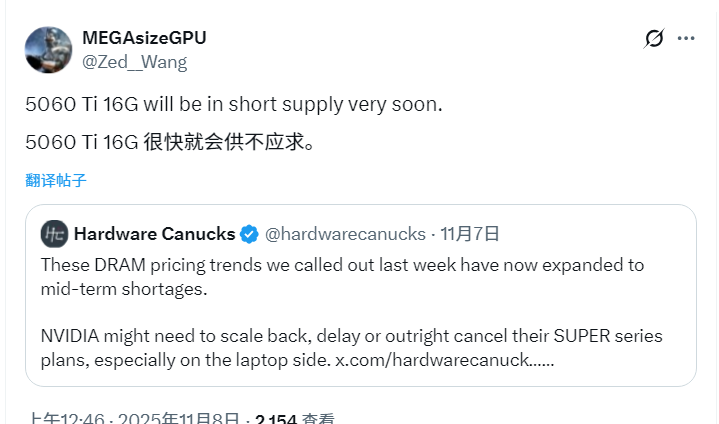 作为RTX 50系列中最受欢迎的型号之一,RTX 5060 Ti的市场需求一直比较稳定,若此时供应短缺,即使厂商能维持少量供货,其市场售价也很可能会大幅上调。