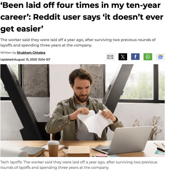 一位在十年职业生涯中经历四次裁员的科技员工在Reddit上分享了反复失业带来的情感和心理影响。”每次自己都被告知’这不是你的问题,只是商业决定’,”他说,”但当你看到自己的岗位被保留下来,甚至同事还能获得晋升,你很难不感到被背叛。”他现在依然受到精神焦虑与缺乏自信的困扰。
