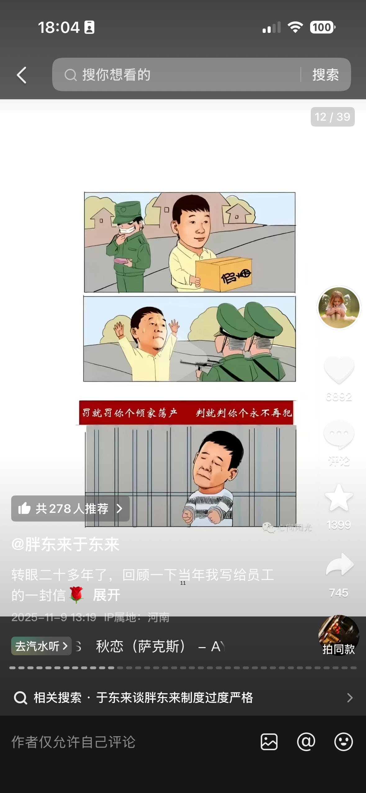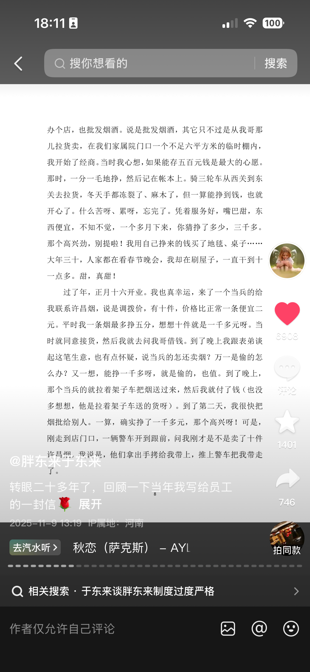 11月9日,胖东来创始人于东来在其个人社交账号上,发布了一封写于2003年12月28日的内部信件。信中,于东来以第一人称视角,文字为主并穿插着漫画,详细讲述了自己创业前的一些经历,其中包含因倒卖香烟被拘留、被抓捕等过往。