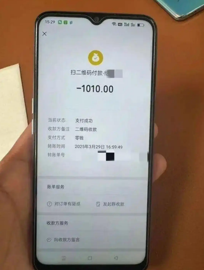 16时59分,男生通过扫描微信二维码向司机转账支付1010元。