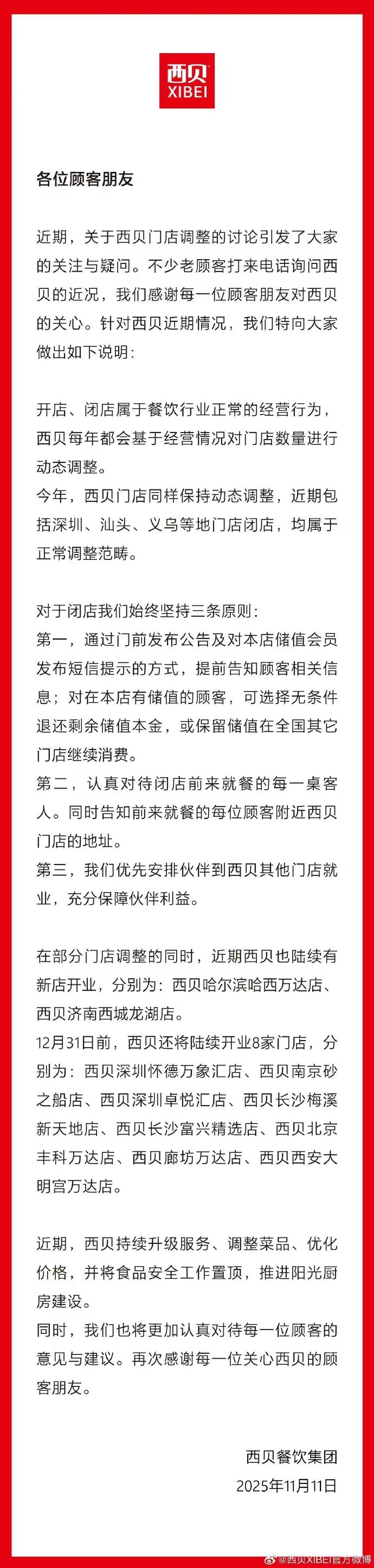 开店、闭店属于餐饮行业正常的经营行为,西贝每年都会基于经营情况对门店数量进行动态调整。今年,西贝门店同样保持动态调整,近期包括深圳、汕头、义乌等地门店闭店,均属于正常调整范畴。在部分门店调整的同时,近期西贝也陆续有新店开业。