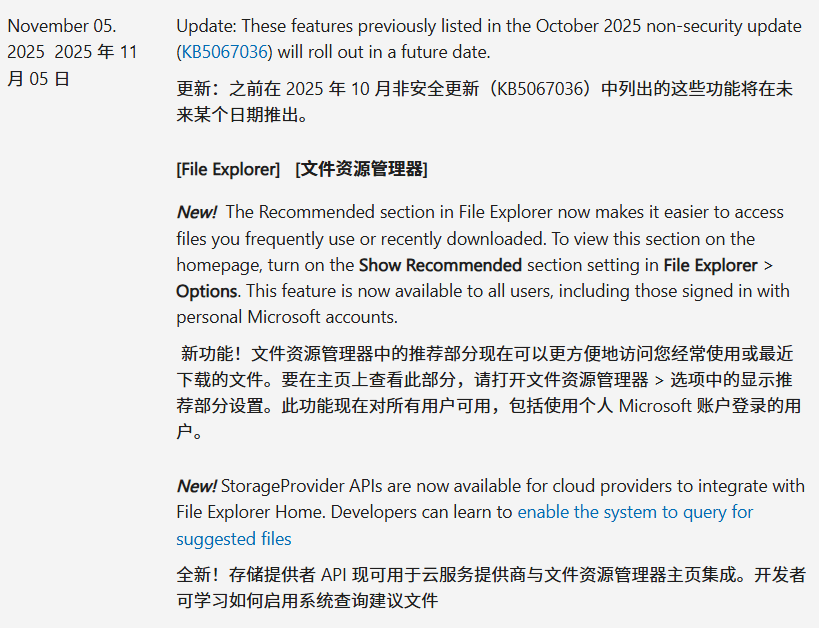 微软官方叫停了其在Windows 11文件资源管理器中新推出的“推荐文件”功能。该功能在经过数月测试后,于10月28日首次面向所有用户推出,但在11月5日,微软就踩下了刹车。微软在更新日志中指出:“这些先前在2025年10月非安全更新中列出的功能,将在未来日期推出。”