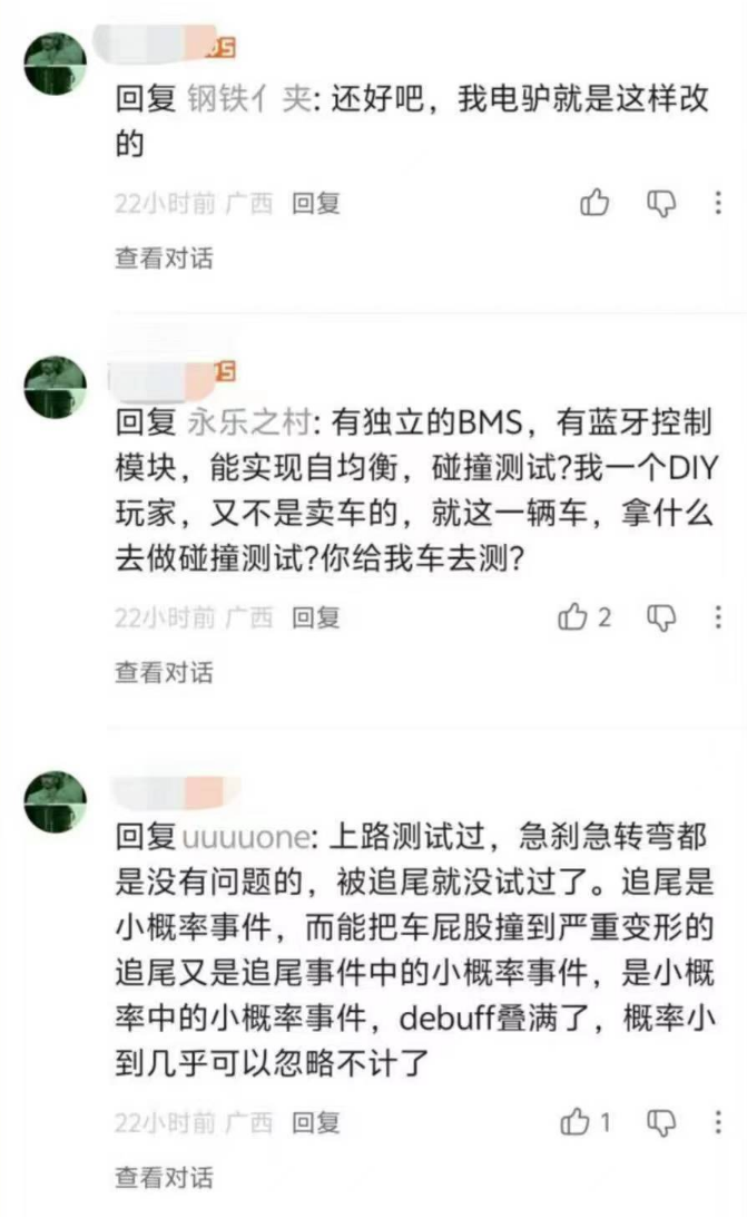 有人就安全性提出质疑,该网友显然非常自信,称自己的电驴就是这样改的,还解释称:有独立的BMS和蓝牙控制模块,能实现自均衡,至于碰撞测试,自己就这一辆,做不了。
