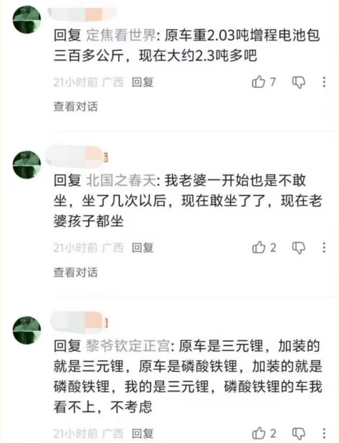 更让人没想到的是,他加装的还是三元锂电池,之所以如此,是因为原车就是三元锂的,他表示自己看不上磷酸铁锂电池。