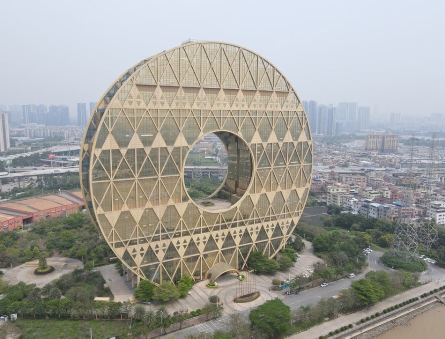 由意大利米兰理工大学教授Joseph DiPasquale设计,灵感源自广东塑料交易所的开市铜锣和南越王墓出土的古玉璧,寓意“天圆地方”与商业繁荣,2013年建成,总投资约10亿元,曾花10 万元公开征名。
