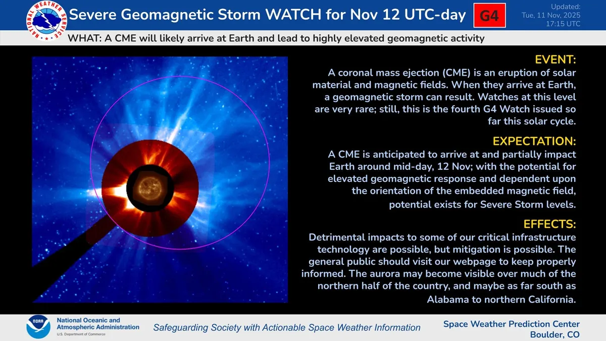 美国国家海洋与大气管理局空间天气预报中心称,这些耀斑都伴随着日冕物质抛射,其包含的高能射线和其他各种高能粒子会合并冲击地球,这可能会引发 G3 级别的强烈地磁暴和大范围极光等。