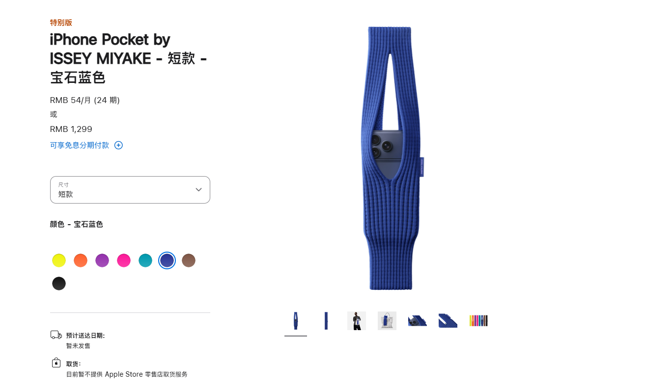 11月14日起,iPhone Pocket将于法国、大中华地区、意大利、日本、新加坡、韩国、英国及美国的部分苹果零售店和苹果官网开卖。其中,中国大陆售价1299元人民币。