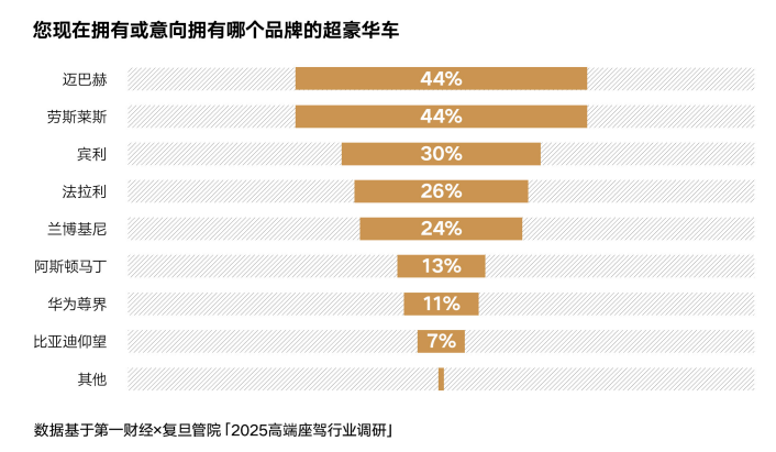 从这部分群体对于豪车品牌的有意程度来看,排在前面的分别是迈巴赫、劳斯莱斯、宾利、法拉利、兰博基尼等,其中华为的尊界和比亚迪的仰望也相继上榜。